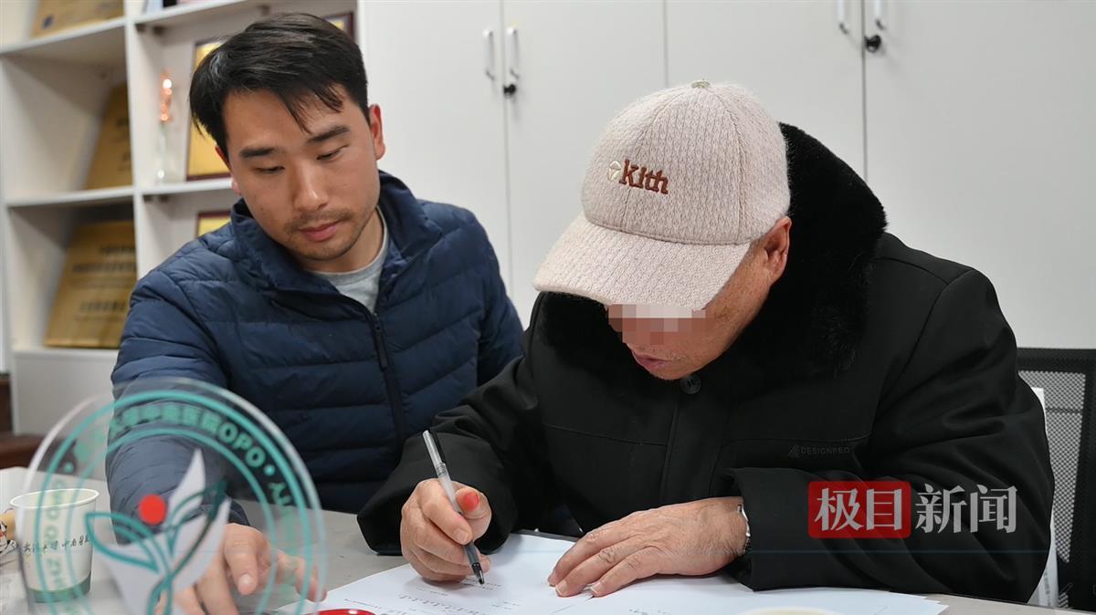陈先生(右)在遗体捐献登记表上郑重签字(极目新闻记者 王晨曦摄)