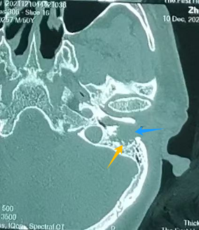 颞骨MRI:左外耳道肿物(蓝色为肿瘤)