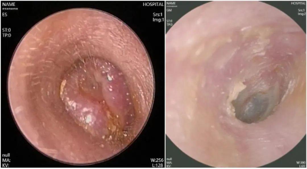 对比右耳:外耳道通畅,鼓膜完整(右图)