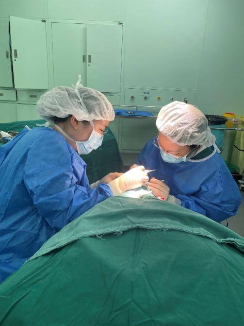 谢瞻副主任医师(右一)与崔宇晴住院医师(右二)手术中
