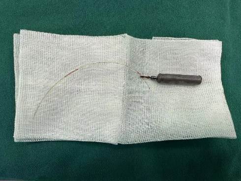 由于患者伤情危急,眼科请放射科急会诊后迅速拟定治疗方案。当日下午,谢瞻副主任医师及崔宇晴住院医师在全麻下急诊为患者施行了左眼眶内异物取出术。术中,医生顺着张先生皮肤伤口原位入路,缓慢牵拉鱼线的同时,钝性分离周围软组织,最终取出完整的鱼线及铅坠,充分清创后分层缝合皮肤伤口,手术顺利结束。