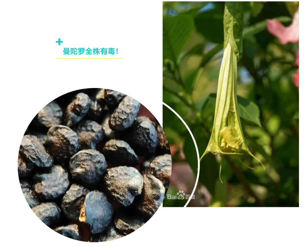 曼陀罗属茄科一年生草本植物,整株有毒,主要成分为东莨菪碱、山莨菪碱以及少量的阿托品等生物碱,以种子含毒量最高。曼陀罗中毒,一般在食后半小时,最快20分钟出现症状,最迟不超过3小时。中毒严重者在24小时后进入晕睡、痉挛、紫绀,最后晕迷死亡。