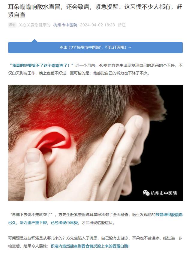 可问题是这些积液是从哪儿来的?方先生陷入了沉思,自己没有去游泳,耳朵也不曾进水,经过进一步检查后,结果令人震惊:积液内竟然能查到胃食管反流上来的胃蛋白酶!