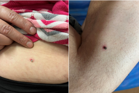接诊的南京明基医院皮肤科主任医师康莉仔细检查了两位患者的皮疹:都是赤豆大小突出的异物,一个呈黑色、一个呈灰色(基底有轻度红肿),放大镜下可以看到边缘部位的多数细小足。由此判断是蜱虫叮咬在了皮肤上。