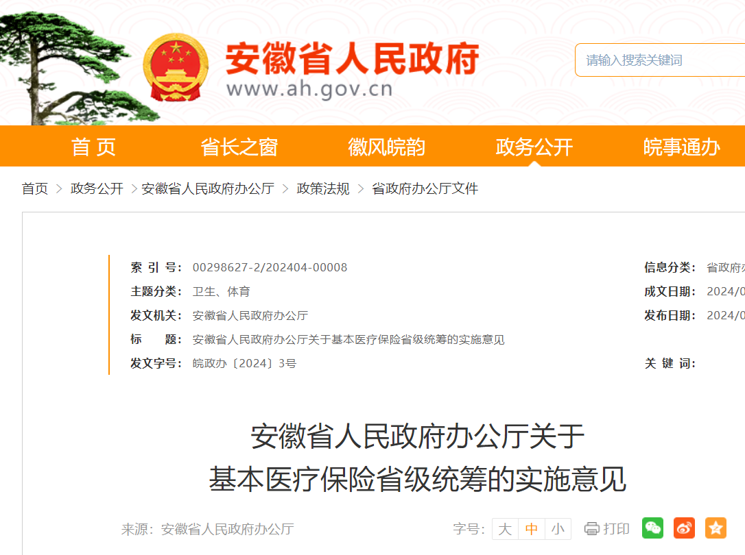 《安徽省人民政府办公厅关于基本医疗保险省级统筹的实施意见》4月15日正式发布。我省将在全省范围内统一参保覆盖范围、筹资缴费政策、待遇保障政策等。实施意见明确,2025年起,组织实施居民医保省级统筹相关政策,实施居民医保省级调剂金制度;规范统一职工医保筹资与待遇保障等配套政策。