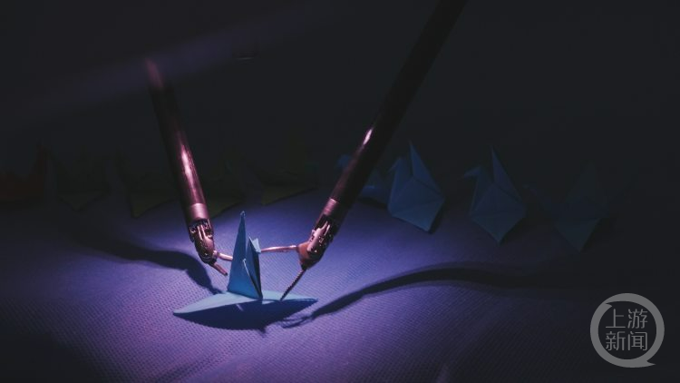 等到彩纸被折成纸鹤,王志强用两个手术钳配合将纸鹤立了起来,两个手术钳分别拉着纸鹤的双翅,轻轻拉扯,模拟出展翅高飞的动作。