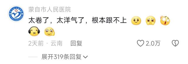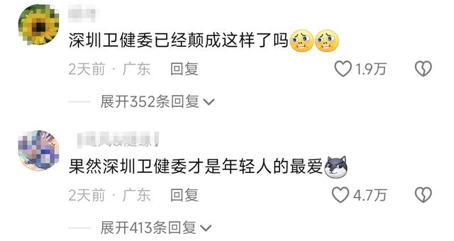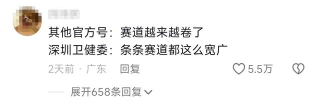 其他官方号可能觉得赛道越来越卷了,深圳卫健委在新赛道就没有输过。好几个医院的官方账号在评论区表示,深圳卫健委太卷了,太洋气了,根本跟不上。
