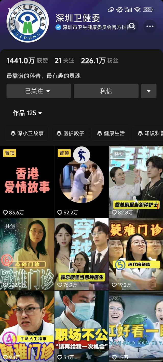 深圳卫健局在抖音和B站上都圈粉不断。在抖音上,深圳卫健委有227.6万粉丝,发布了125个作品,最早一个视频发布于2019年。在B站上,也有70.7万粉丝。虽然风格一直是轻松搞笑的,但是让深圳卫健委彻底火出圈的,还是最近的霸总短剧和疑难门诊系列短视频,也许出圈秘笈就是他们的简介:“最靠谱的科普,最有趣的灵魂!”