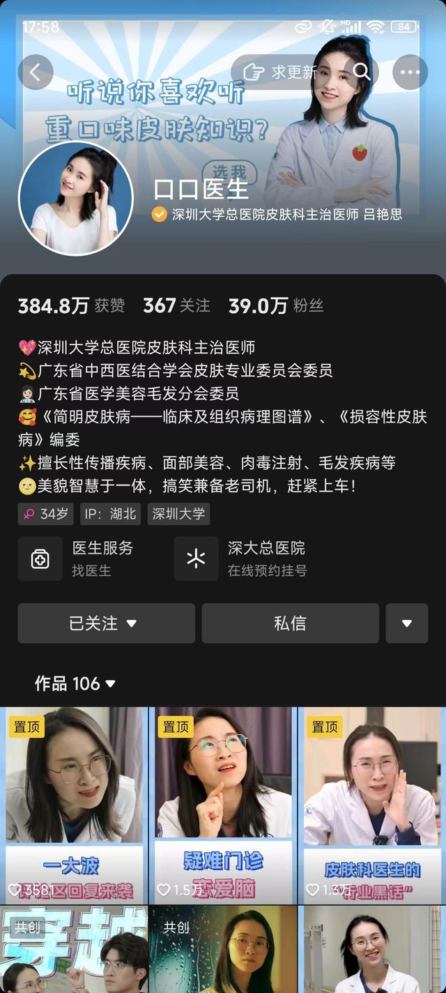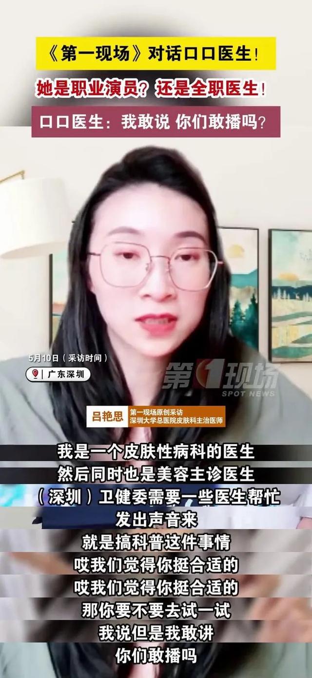 其实,他们不是演员,而是真的医生!深圳卫健委的台柱子,也就是多个霸总穿越剧的主演“口口医生”,是深圳大学总医院皮肤科主治医师吕艳思,是正儿八经的三甲医院主治医师。