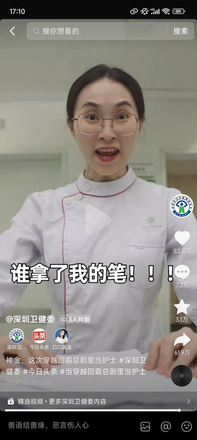 5.12护士节前夕,深圳卫健委的短视频《霸总剧里当怨种护士》又火上了热搜,这是他们继《霸总剧里当怨种医生》后的又一“穿越”力作,看爽了的网友们惊呼:深圳卫健委根本没有瓶颈!连“人民日报评论”也专门下场,研究深圳卫健委为什么这么火。
