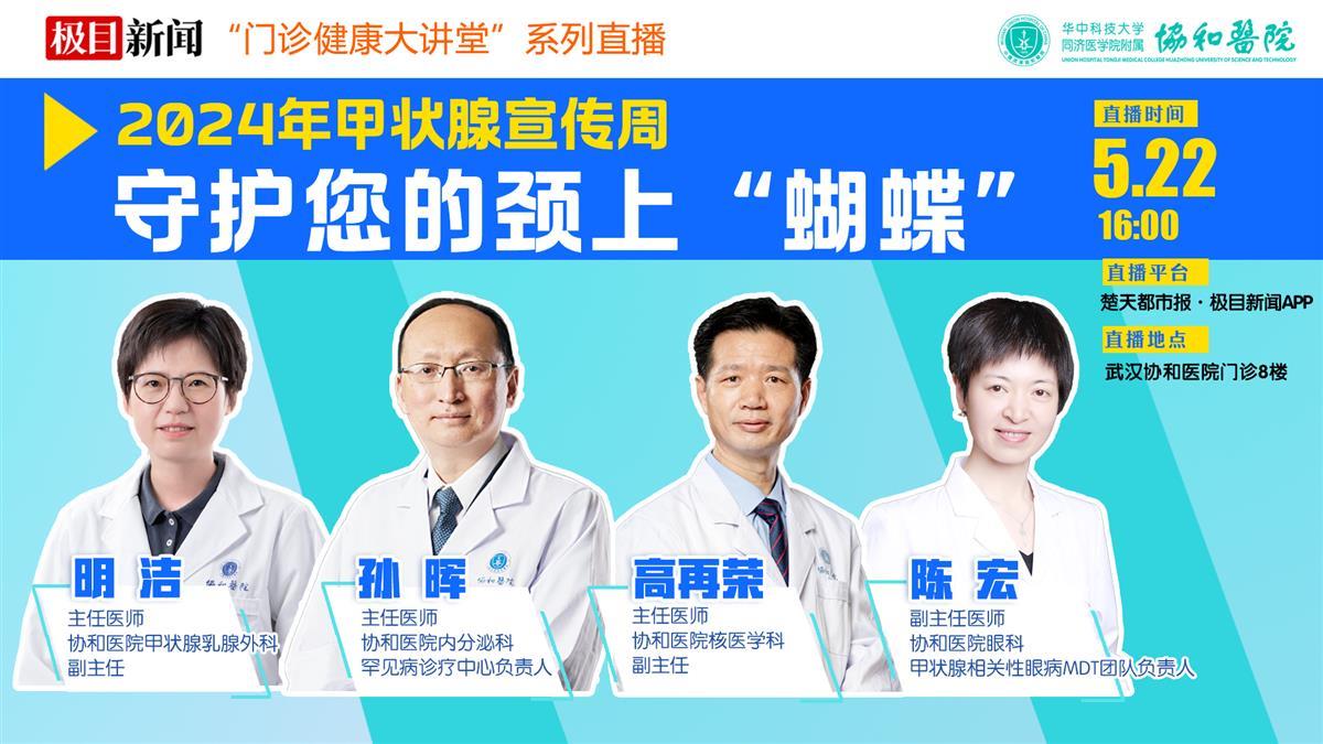 没有大脖子和突眼睛,甲状腺就一定是健康的吗?甲亢、甲减到底能不能吃碘盐?查出甲状腺结节怎么办?近年来,随着生活节奏的加快,甲状腺疾病的发病率逐年上升,成为威胁人类健康的重要疾病之一。2024年5月20日到26日是第十六届“国际甲状腺知识宣传周”,22日16时,武汉协和医院内分泌科、甲状腺乳腺外科、核医学科、眼科专家组成的多学科团队,将做客楚天都市报·极目新闻直播间,开启“门诊健康大讲堂”科普讲座,共同守护您的颈上“蝴蝶”。