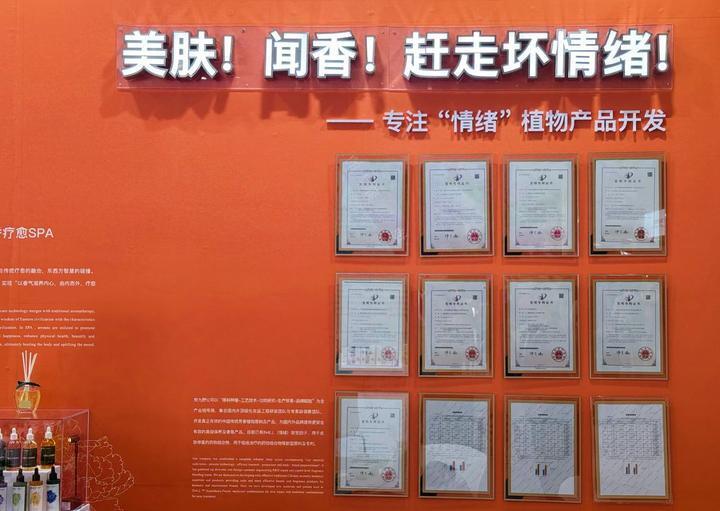 潮新闻记者来到展会的原料、精油展区,这里是“情绪护肤”产品主阵地。一进门,扑面而来的香气顿时令人心情愉悦,来自全球各地的展位挤满了谈生意的人。