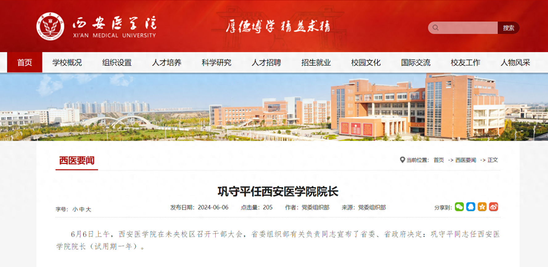据西安医学院官网消息:6月6日上午,西安医学院在未央校区召开干部大会,省委组织部有关负责同志宣布了省委、省政府决定:巩守平同志任西安医学院院长(试用期一年)。