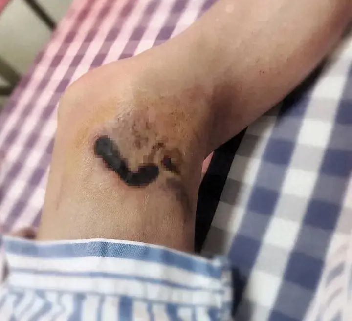 接诊医生掀开陆大伯的裤脚,不禁倒吸一口凉气,只见患者左大腿内侧可见大片状水肿性暗红斑,向上蔓延至左侧腹股沟下,向下蔓延至小腿,红斑中央已出现了明显的黑色焦痂,周围还遍布着硬结。