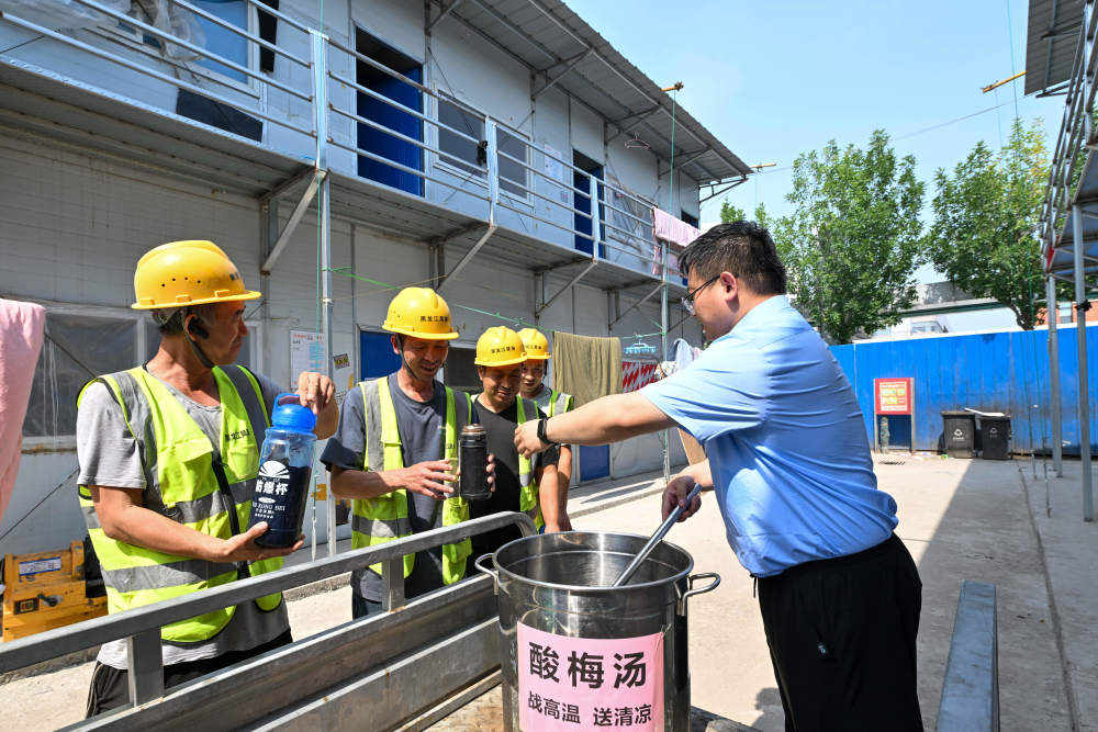 6月13日,在位于天津的中建二局北方公司华北分公司一项目工地,项目中心工作人员在工人休息区发放酸梅汤。新华社记者 孙凡越 摄