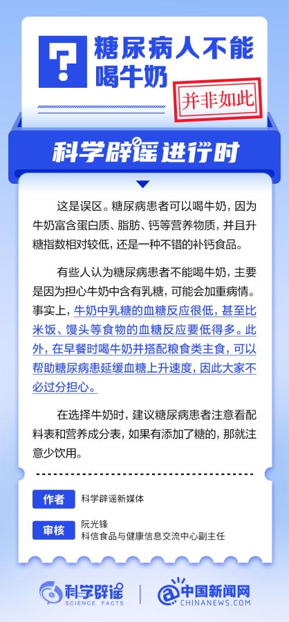 中新网6月18日电 糖尿病患者可以喝牛奶,因为牛奶富含蛋白质、脂肪、钙等营养物质,并且升糖指数相对较低,还是一种不错的补钙食品。牛奶中乳糖的血糖反应很低,甚至比米饭、馒头等食物的血糖反应要低得多。在选择牛奶时,建议糖尿病患者注意看配料表和营养成分表,如果有添加了糖的,那就注意少饮用 。(来源:@科学辟谣 中国新闻网微博 )