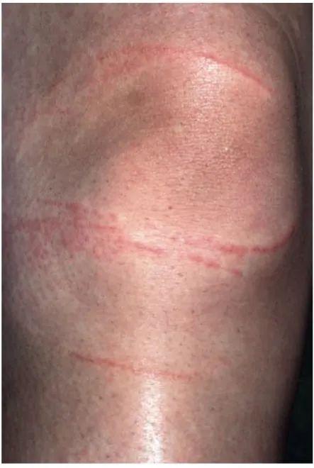 几分钟后(或数小时后)出现线状、红色的荨麻疹样皮损;