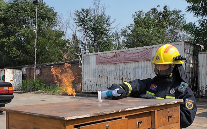 现场,消防员先点燃了一支蜡烛,然后将这些喷雾对准火苗,依次喷射。记者注意到,蜡烛持续燃烧,有些喷雾气体喷出的一瞬间,火苗甚至变得更旺,延伸成数十厘米长的“火舌”。