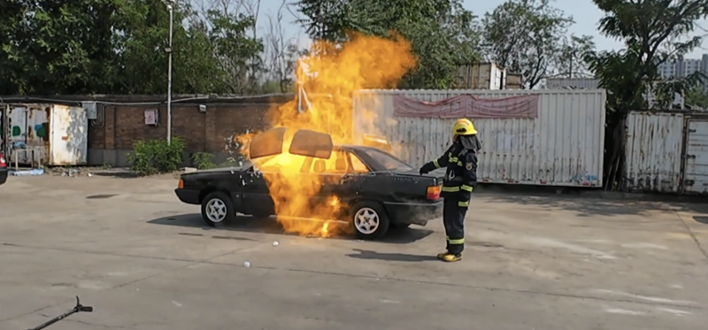 然后,消防员将两罐降温喷雾喷洒在一辆报废汽车内。关上车门,模拟高温密闭空间。随后,消防员点燃了一块酒精棉,摇下车窗,利用一根木棍将酒精棉放入车内,几乎同时,车内发生轰燃,传来一声巨响。