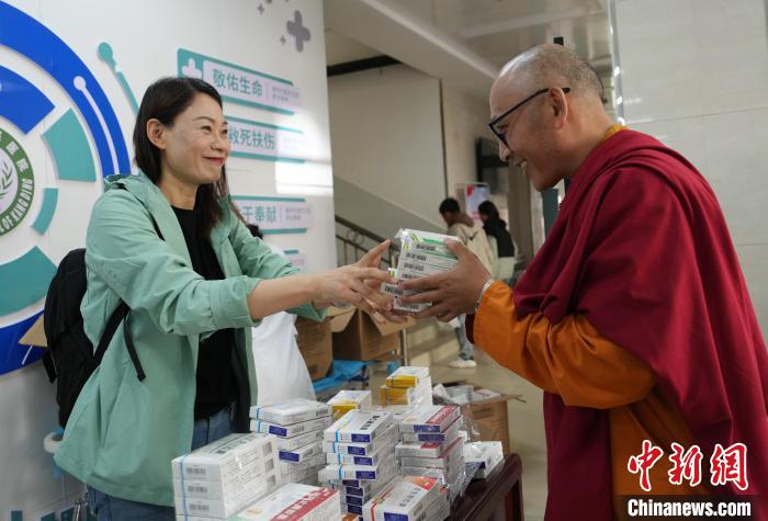 7月9日,“同心·共铸中国心”志愿者深入四川康定开展医疗帮扶活动,来自北京多家医院的医疗专家针对当地民众发病率较高的相关疾病在康定市人民医院开展免费义诊工作。图为免费发放药品现场。 中新社记者安源摄