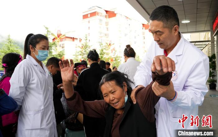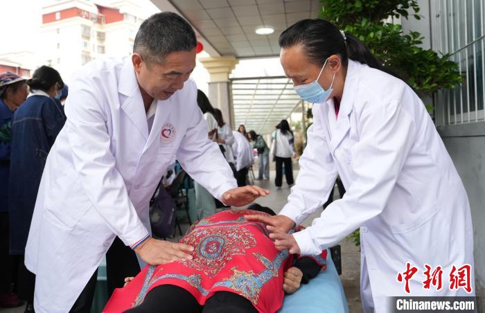 7月9日,“同心·共铸中国心”志愿者深入四川康定开展医疗帮扶活动,来自北京多家医院的医疗专家针对当地民众发病率较高的相关疾病在康定市人民医院开展免费义诊工作。图为北京中医药大学副教授、中医师朱峻达(右)在义诊现场为患者进行中医正骨推拿。 中新社记者安源摄