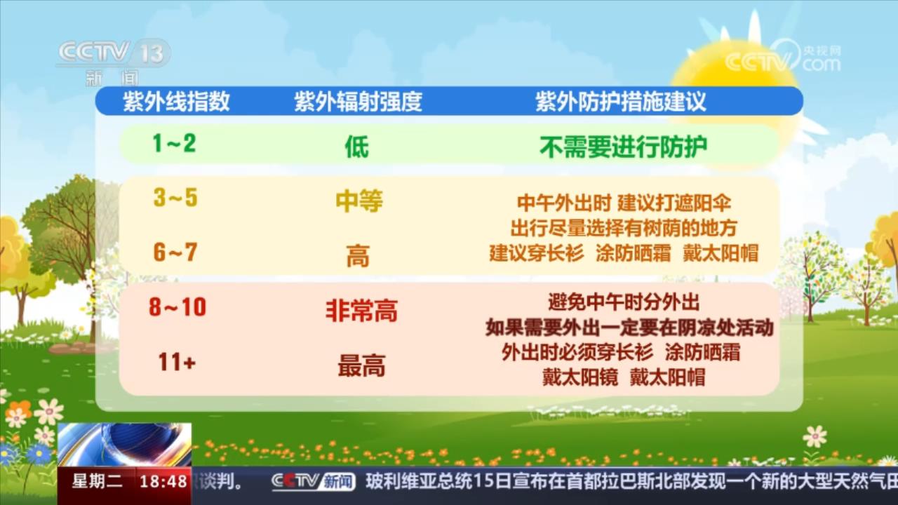 紫外线指数2以下,可以安全进行户外活动。指数3至7。外出时,需要采取一定的保护措施,中午时间尽量找遮阴处。指数8至11级以上,应减少户外活动,在户外时,多停留遮阴处。