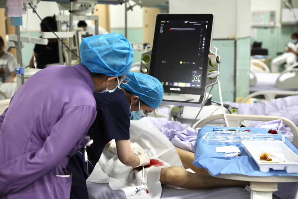 晚上11点,一位88岁的老人在急诊抢救室内突发肾衰竭,急诊医生为他做股静脉穿刺术,在床旁进行血滤。