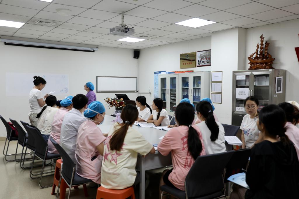 晚上7点,护士长组织新到岗的护士和实习护士在会议室进行急诊理论知识的学习和实操方面的训练,其中一位护士正在汇报自己的题目。