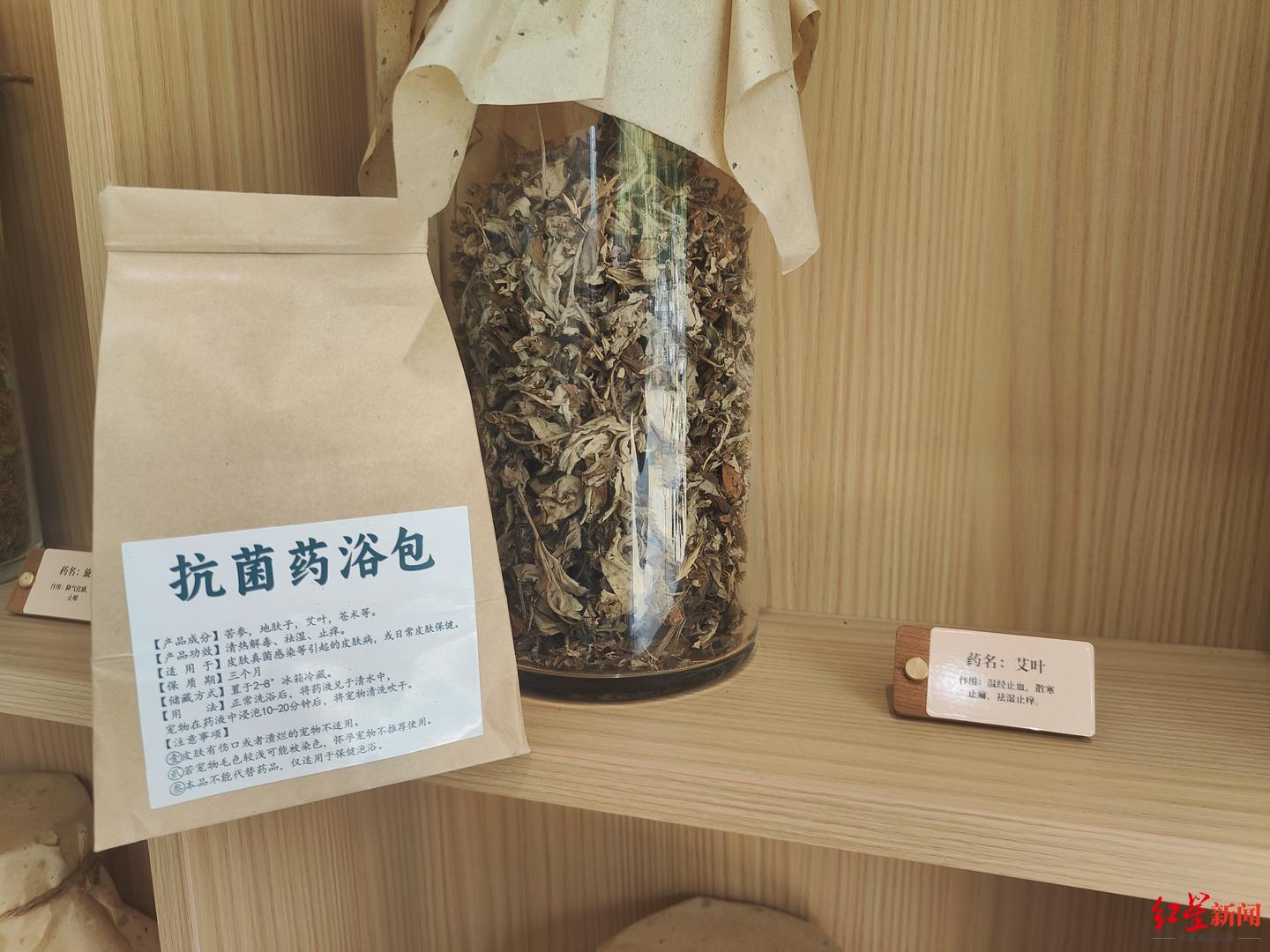 另一边,狗主人杨先生拿着医师刚开的处方,给他的宠物“豆豆”抓药。“最近一个月经常拉肚子,给他吃了各种药,效果不明显。后面我老婆在网上刷到这家宠物中医馆之后,就想带着来试一下。”杨先生告诉记者,这是他们第一次尝试中兽医治疗,“以前‘豆豆’只吃狗粮,最近一两年经常吃一些人类食品,很辣的也吃,怀疑是这个习惯把肠胃吃坏了。”