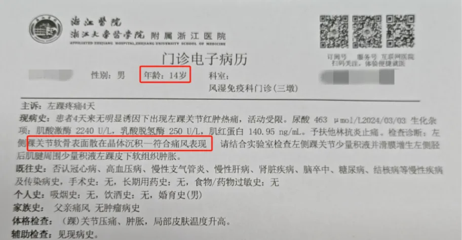 2024年4月,浙江医院就曾介绍了这样一个案例:浙江杭州14岁的初中生小木(化名),在一次吃完火锅后,大脚趾突然剧烈疼痛到无法走路,吃了止疼药也止不住,被父母用轮椅推到医院,被医生诊断为“痛风”。