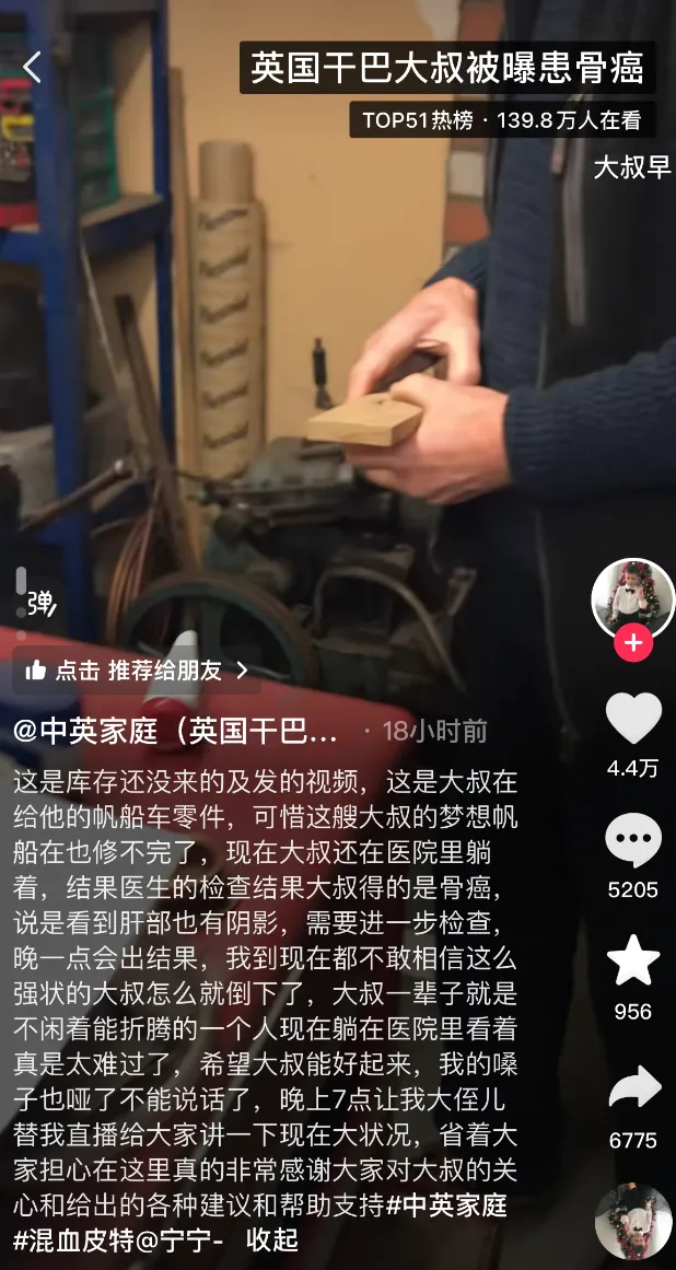 这是一个中英结合家庭分享的日常,因中国阿姨魔性的口音和英国大叔的呆萌可爱而让账号爆火,“干巴lunch”一词也火了,英国大叔得名“干巴大叔”。而在最近一次直播里,“干巴大叔”却被曝确诊骨癌。