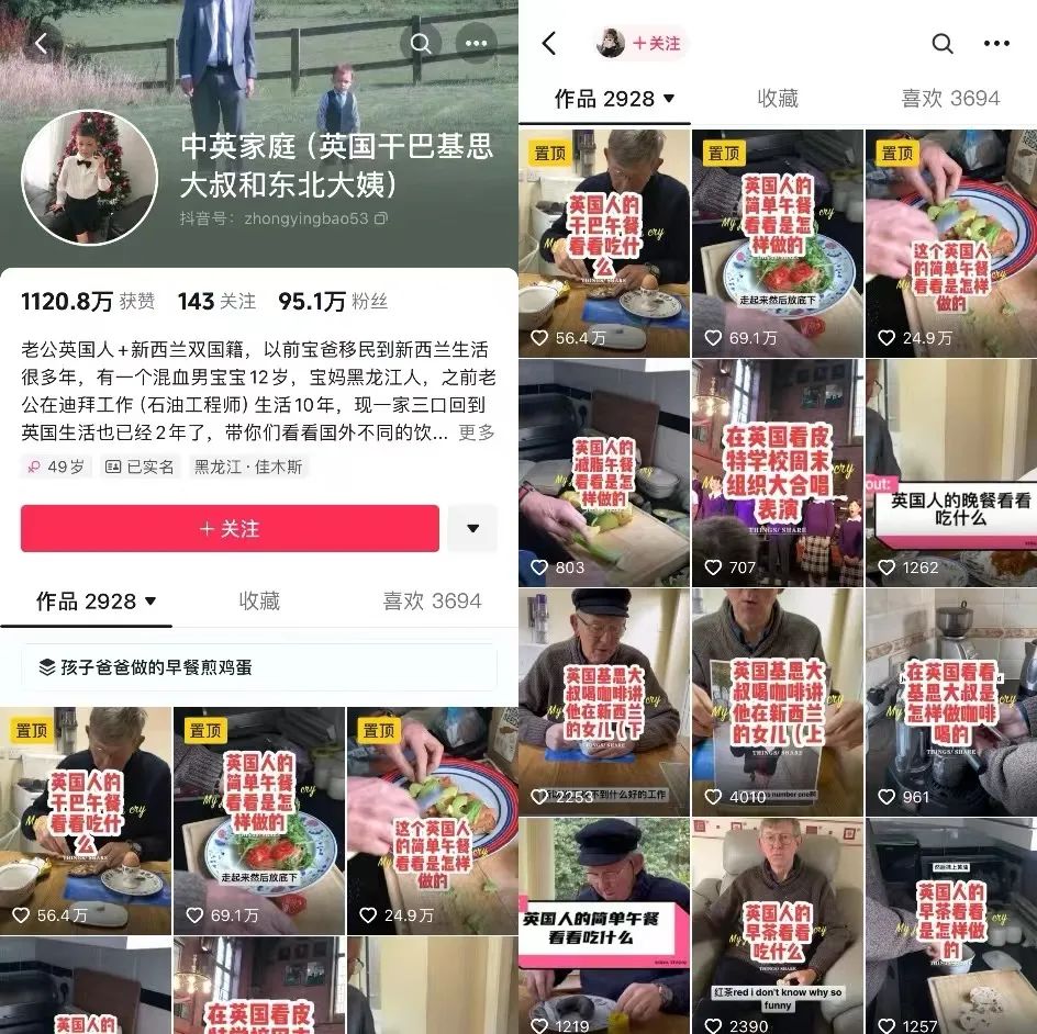 新榜旗下抖音数据工具新抖显示,干巴老头出镜的账号“中英家庭(英国干巴基思大叔和东北大姨)”近一个月涨粉50万,超过90%的同级达人,抖音上相关话题更有超过6亿人次围观。