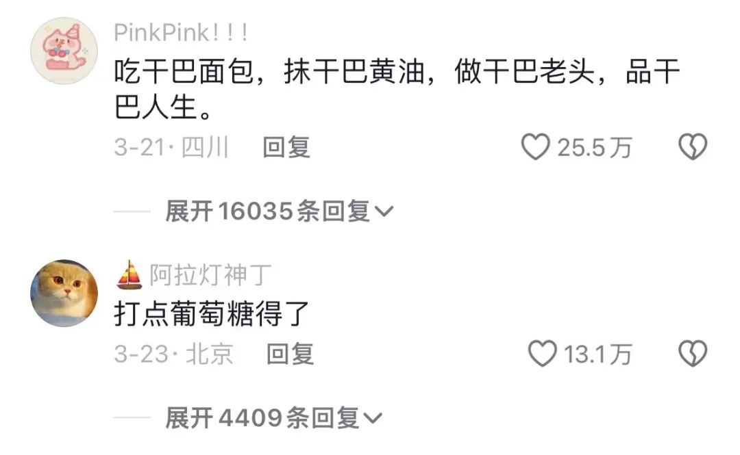 网友一边嫌弃干巴,一边也在效仿,也没忘记给他的每一顿饭贡献热度,流量高的视频在抖音单条获赞超过69万次,小红书单条笔记获赞1.3万次。