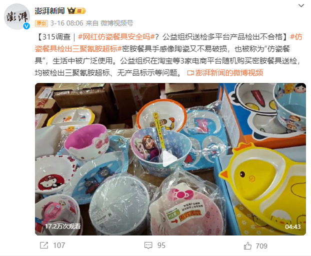 仿瓷碗,即密胺餐具,手感像陶瓷又不易破损,也被称为“仿瓷餐具”,生活中被广泛使用。据澎湃新闻此前报道,公益组织在淘宝等3家电商平台随机购买密胺餐具送检,均被检出三聚氰胺超标、无产品标示等问题。