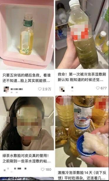 近期,社交平台上一位博主的视频又将茶饮送上热搜。该名博主表示,无意中从便利店冰柜中购买一瓶冰镇的茶饮敷脸后发现,因烈日暴晒泛红的脸很快就褪红了,这个现象让她认为,“茶饮敷脸有舒缓皮肤的功效”。