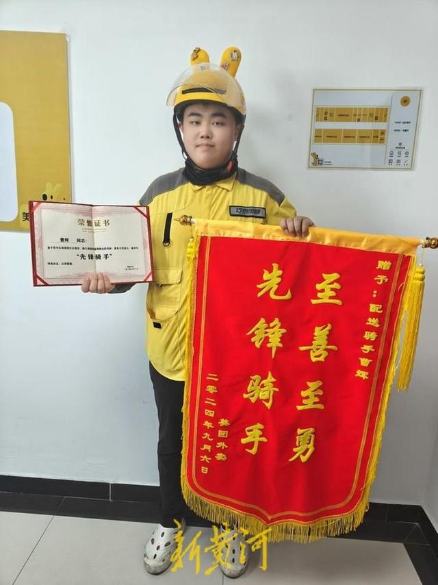 在了解到曹辉捐献造血干细胞救助他人的事迹后,9月6日,美团外卖平台为曹辉颁发了“先锋骑手”荣誉称号,表彰他积极救助他人的行为。手握荣誉证书和奖金,曹辉很激动,“非常感谢平台的奖励,以后我会继续努力工作,同时更多地去帮助他人、参与公益事业。”他说,“作为‘00后’,我们已经接过了新时代的接力棒,以后,该挑的担子,我们也能挑起来,该担的责任,我们也能担起来!”