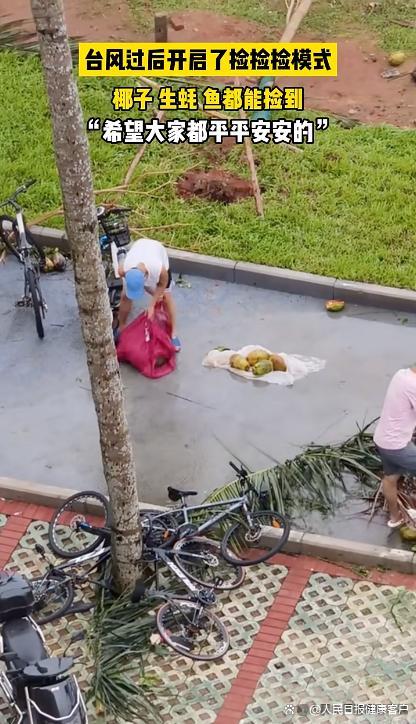 当天,不少定位在海南的人发视频记录自己或他人在路边捡椰子。海口市民陈先生说,小区和外面有很多椰子树,台风过后很多人去捡椰子,他也去了。