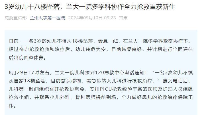 近日,甘肃一名3岁的幼儿不慎从18楼坠落,命悬一线。经过抢救和治疗后,幼儿转危为安,目前恢复良好。