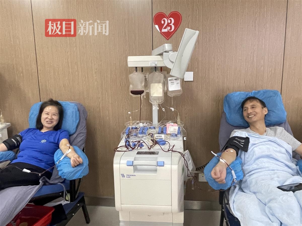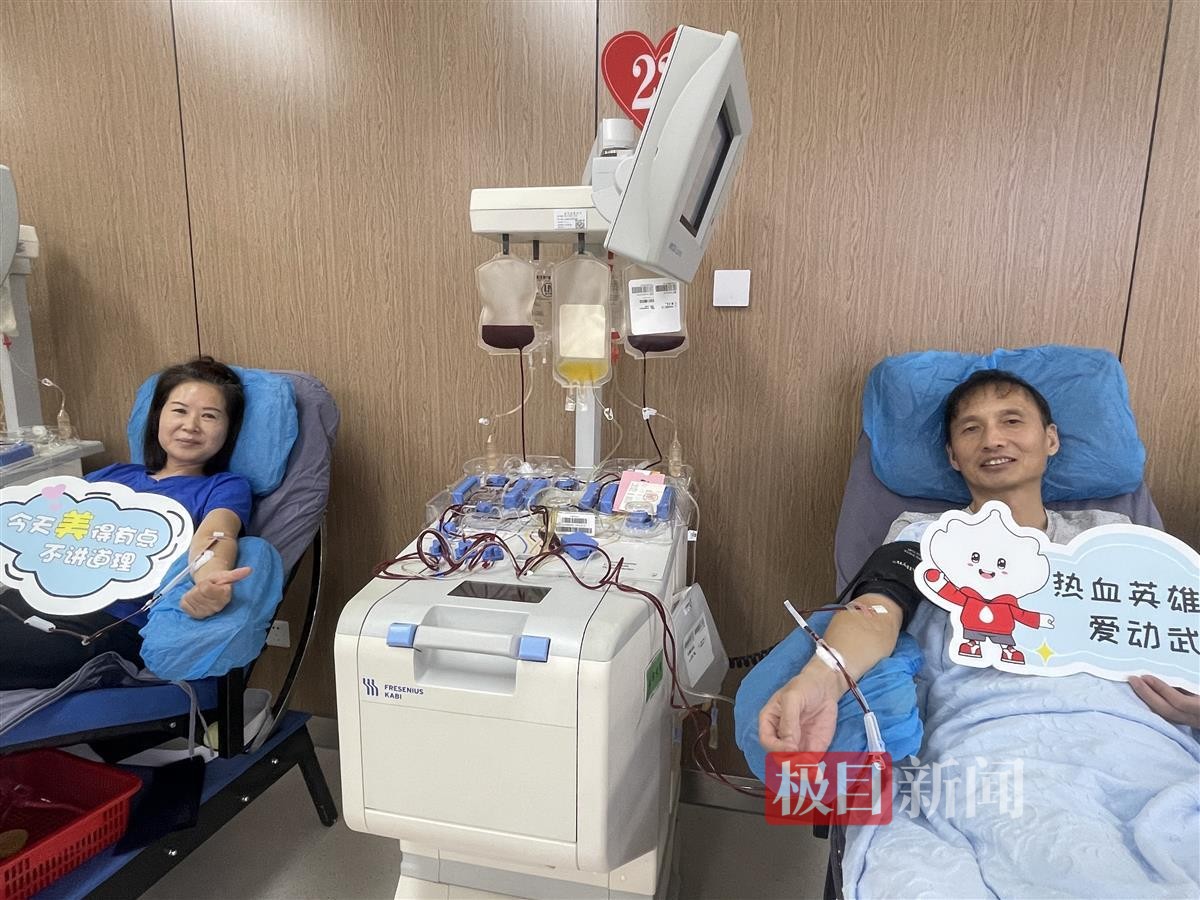 “我们今天都是第102次献血。”204次献血、捐献血小板共计206.5个治疗剂量(献一个治疗剂量血小板相当于200毫升全血),捐献的血液足以让约207名患者得到及时的救治,是刘晓红和张绍权4年来的热血成绩单,也是二人“红色浪漫”的最好诠释。