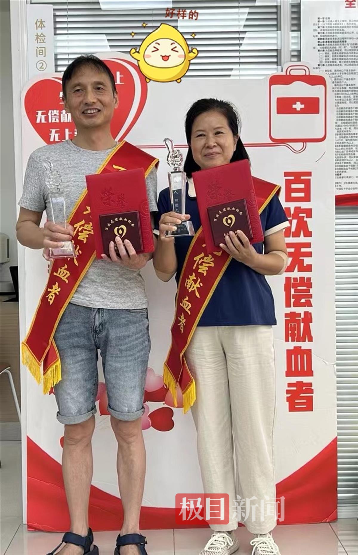 2024年8月14日,夫妻俩双双完成百次献血(闫蕾摄)