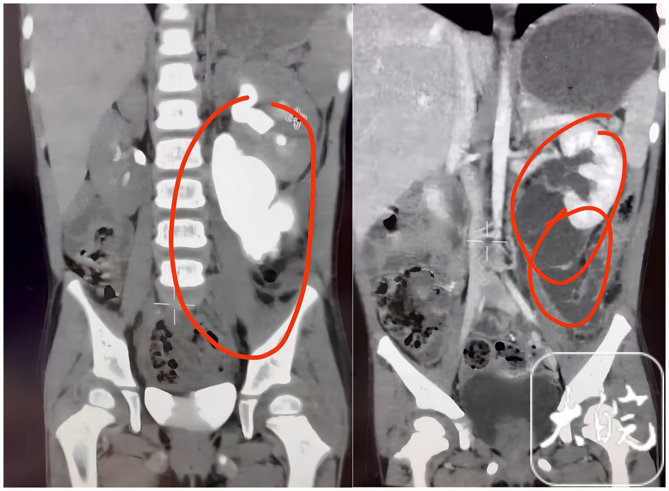 然而,次日,美美突然出现左侧腰腹部疼痛,并且腹部明显隆起,家长便立刻带其至合肥就诊。安徽省儿童医院(复旦儿科安徽医院)儿童泌尿外科主任医师曹永胜接诊后详细询问病史,高度怀疑孩子可能存在左侧输尿管断裂,通过进一步检查证实为左侧肾盂输尿管连接处断裂。