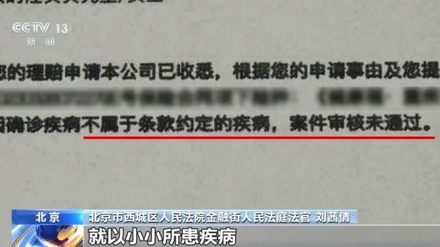北京市西城区人民法院金融街人民法庭法官刘茜倩:汪女士就向保险公司提出理赔申请重大疾病保险金10万元。保险公司在审查理赔申请之后,就以小小所患疾病,不属于保险合同约定的重大疾病范围为由,向小小发出了拒赔通知书。