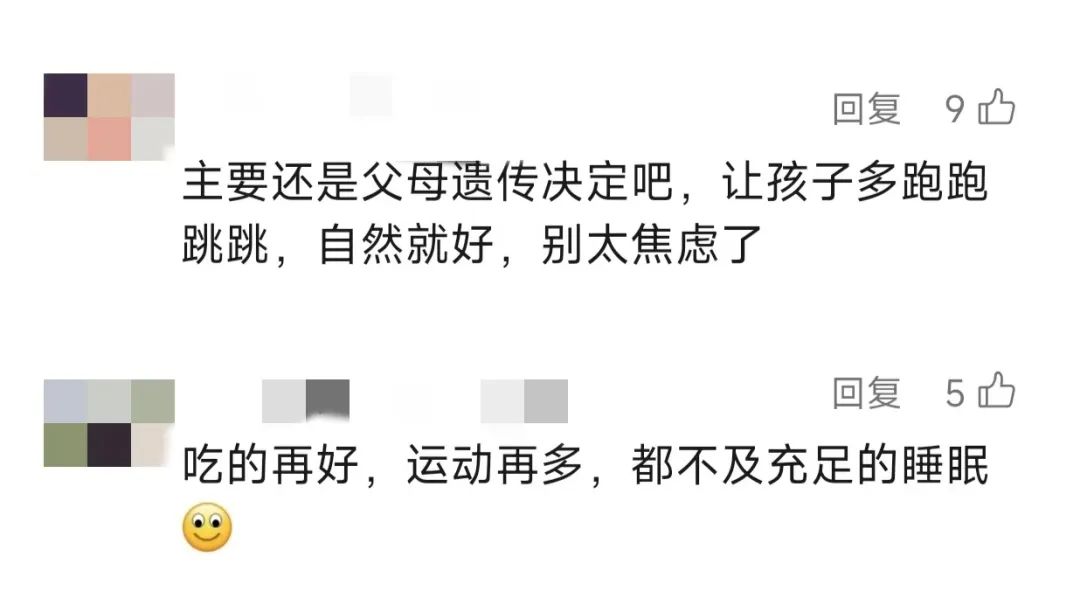 “睡眠的质量和生长激素的分泌呈现正相关的关系,睡眠质量好,深睡眠时间长,生长激素分泌就充分。因此,孩子晚上早点睡,睡得好很重要。”医生补充道,另外,每天户外运动也有助于孩子长高,有研究表明,经常运动的孩子,比不运动的同龄儿童平均高出4-8厘米,秋冬季节,在温度合宜情况下建议进行户外活动,以跳跃、摸高、打篮球等纵向运动为主。