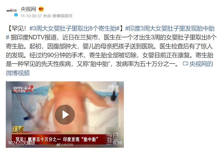 印度3周大女婴腹内8个寄生胎,此前也有11个案例