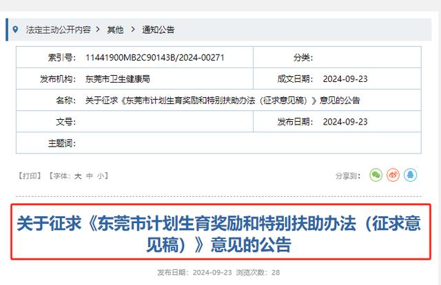 9月23日,东莞市卫生健康局发布关于征求《东莞市计划生育奖励和特别扶助办法(征求意见稿)》意见的公告。