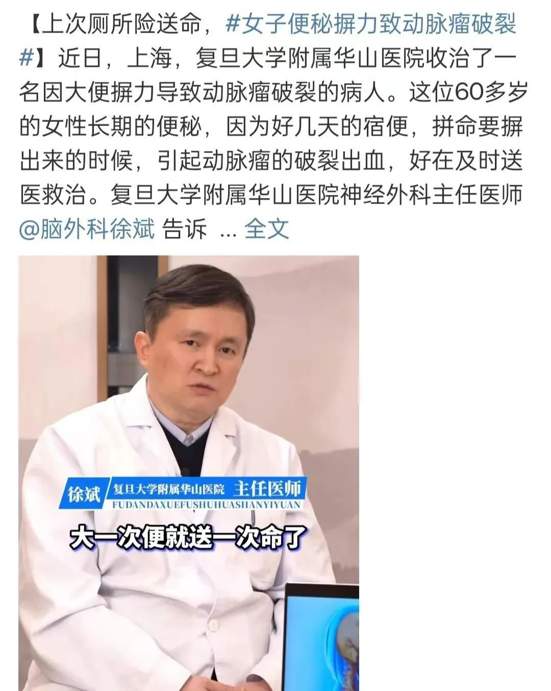 2022年3月,上海一60多岁女性因排便摒力导致动脉瘤破裂出血。
