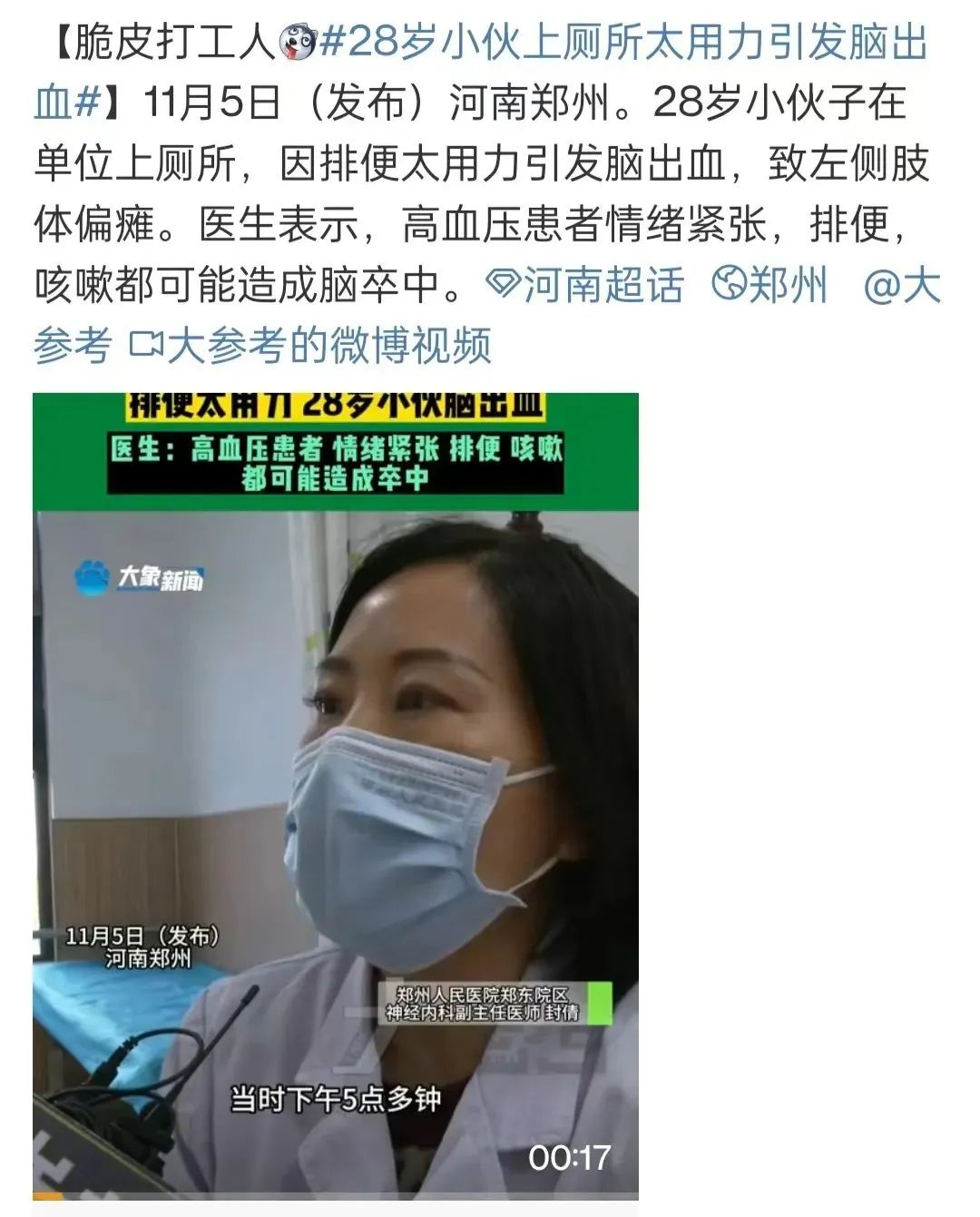 2023年11月,河南郑州一28岁小伙子在单位上厕所,因排便太用力引发脑出血,致左侧肢体偏瘫。