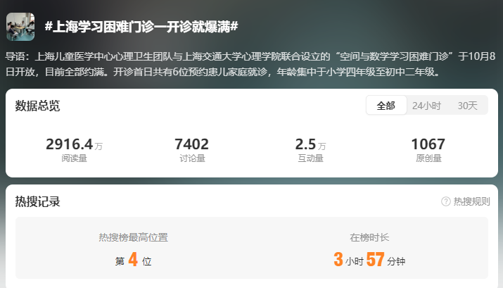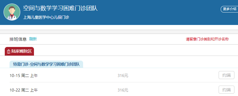 据了解,“空间与数学学习困难门诊”由上海儿童医学中心心理卫生团队与上海交通大学心理学院联合设立,服务“学习数学、物理、化学等感到困难的学生”。10月10日,记者查询“上海儿童医学中心”微信官方服务号发现,院方每周二上午提供8个号源,挂号费为316元。目前,10月15日与10月22日的门诊已经全部约满。