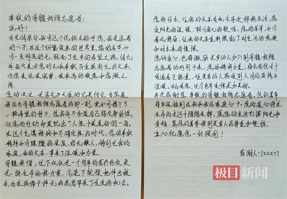 捐献结束后,她收到了受捐者的儿子委托工作人员送来的手写感谢信,信中深情致谢道:“感谢您毫不犹豫地伸出援手,为在病痛中挣扎的患者带来了重生的机会。您的付出,让我的父亲有机会再次拥抱生活、感受阳光的温暖、聆听鸟儿的歌唱,您的善举,如同春风拂面,让我的父亲重新燃起了对生活的热爱和对未来的憧憬……”