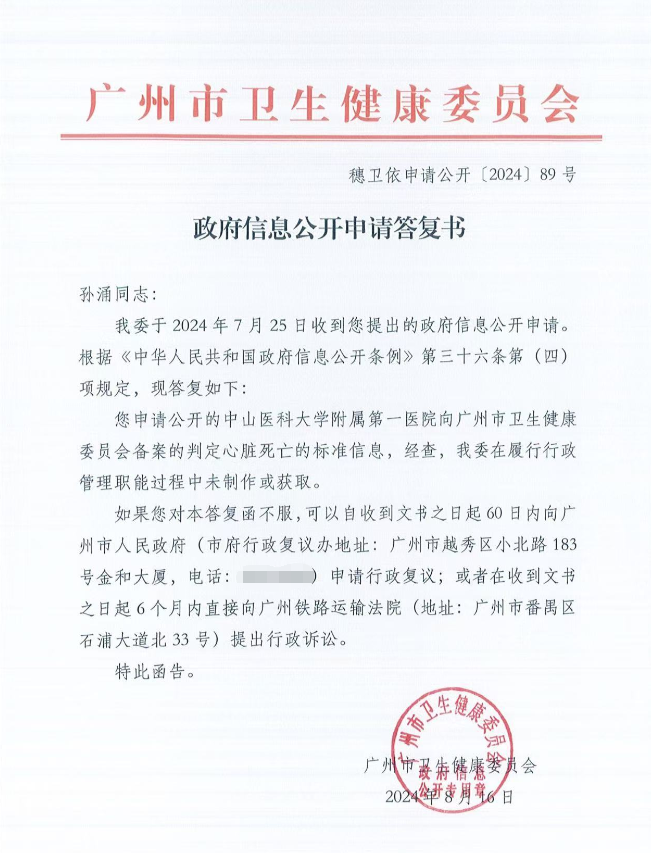 对于本次申请过程,孙涌表示,其于今年5月15日向国家卫健委提交申请,申请内容为公开我国关于死亡标准的法律规定。此后,他又陆续向广州市卫健委申请公开中山大学附属第一医院备案的判定心脏死亡的认定标准,向深圳市卫健委等申请公开深圳市人民医院备案的肺性死亡、心脏死亡的判断标准。